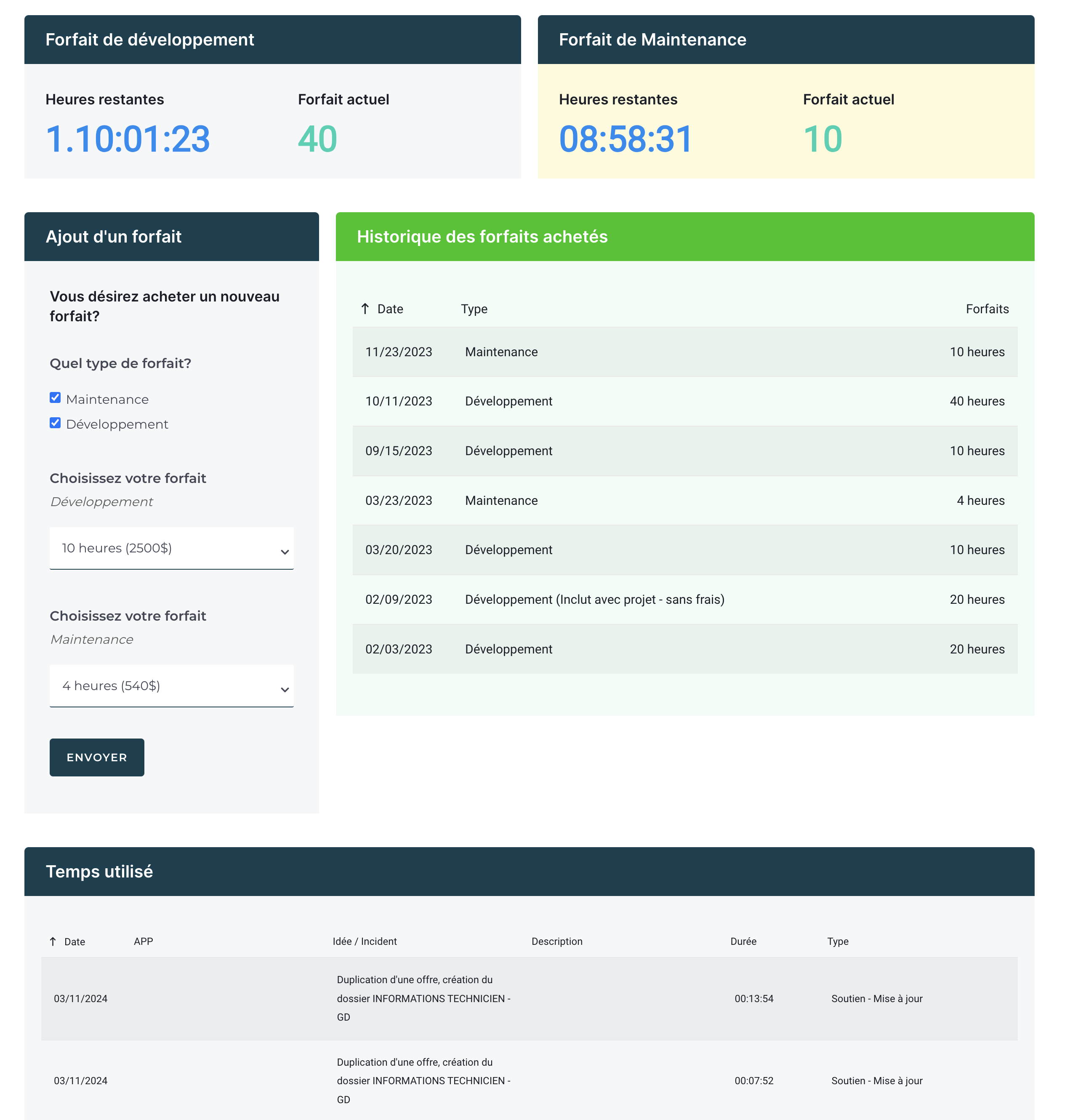 The “Packages” page allows you to view all the details of time used, packages purchased and the remaining hours of your development and maintenance packages. You can also purchase a new package.