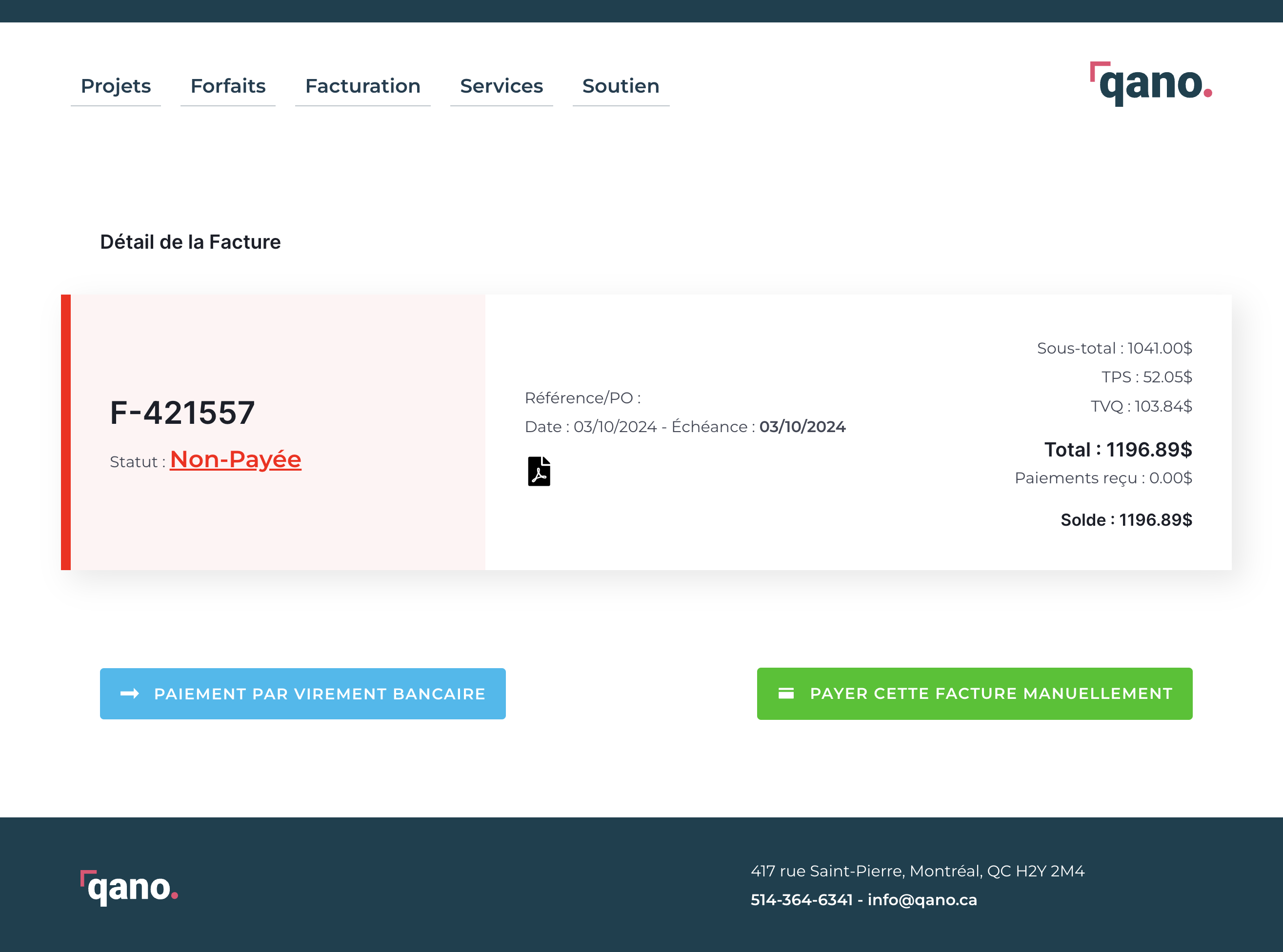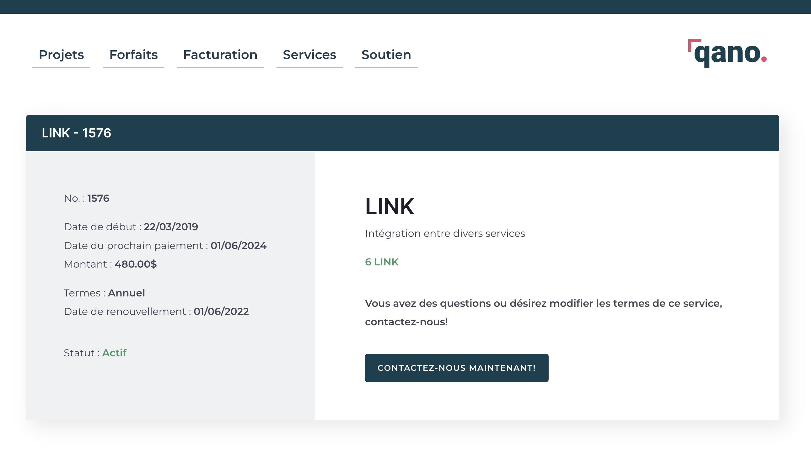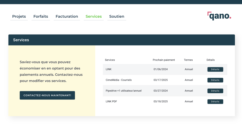 The “Services” page gives you access to all active services with Qano. You will be able to see the details, the next renewal date, the price paid, current usage and the possibility of modifying these according to the service.
