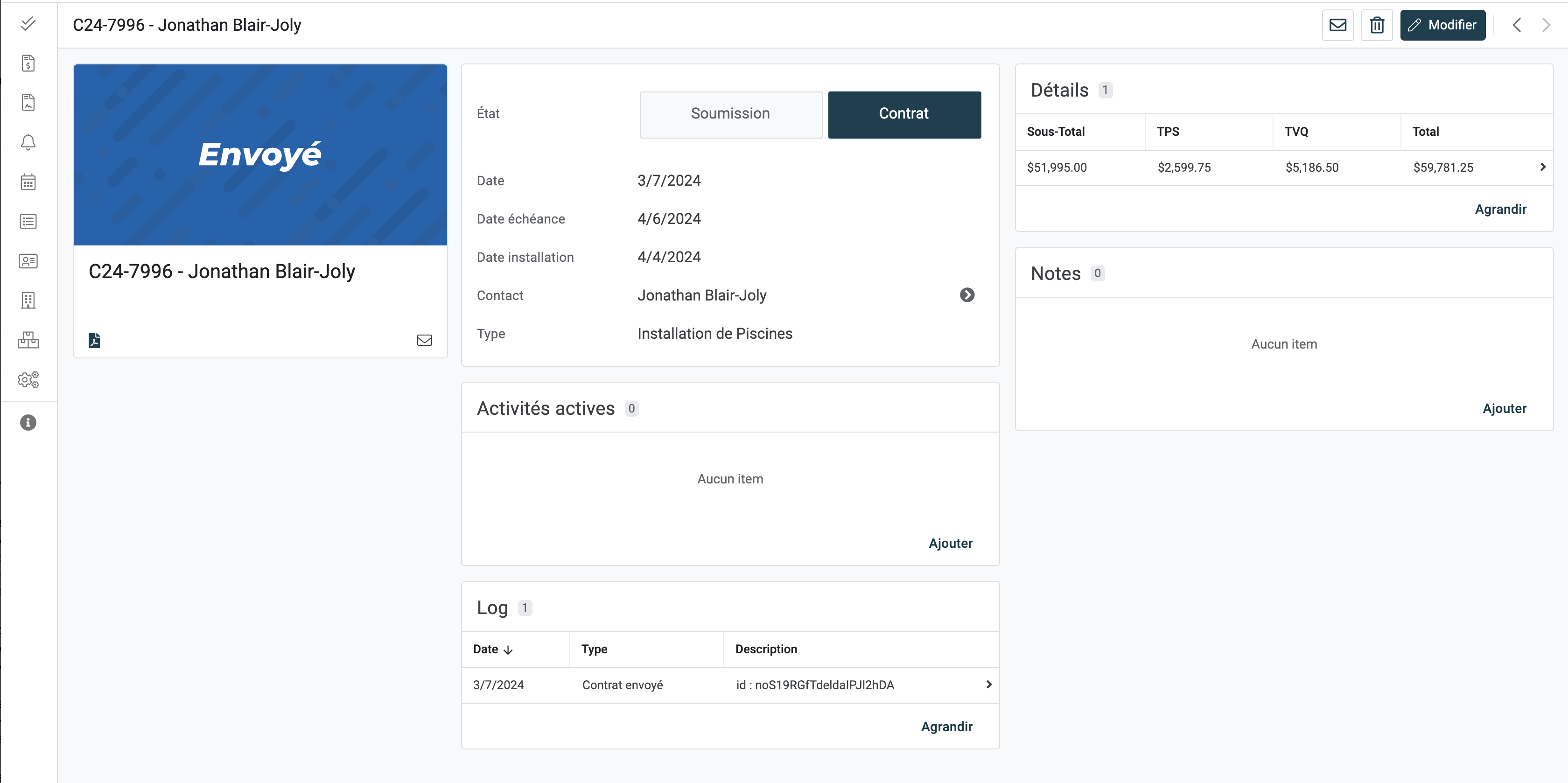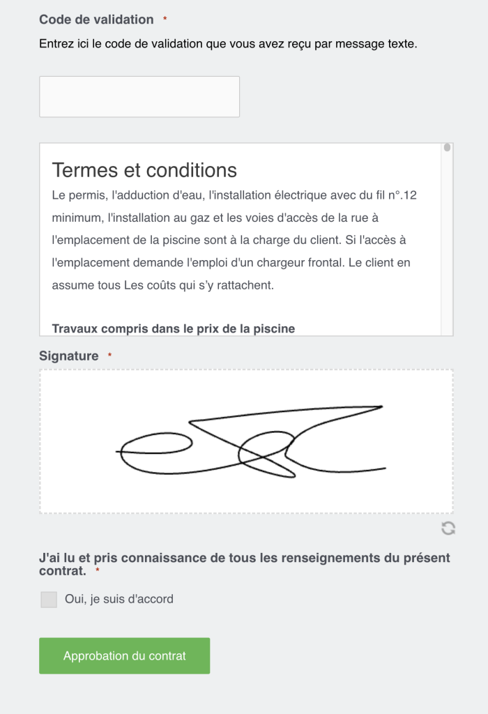 He then asked us if we had a solution for him. As he was already using Qano SER, we added our Approval module to his application. We have created a very efficient system. The quote is sent to the customer. If the customer accepts the quote, a link to a secure page is automatically sent for contract signature. A code is sent by SMS to the number on file, the customer must enter the code received. The information is added to the contract with its IP address and signature.