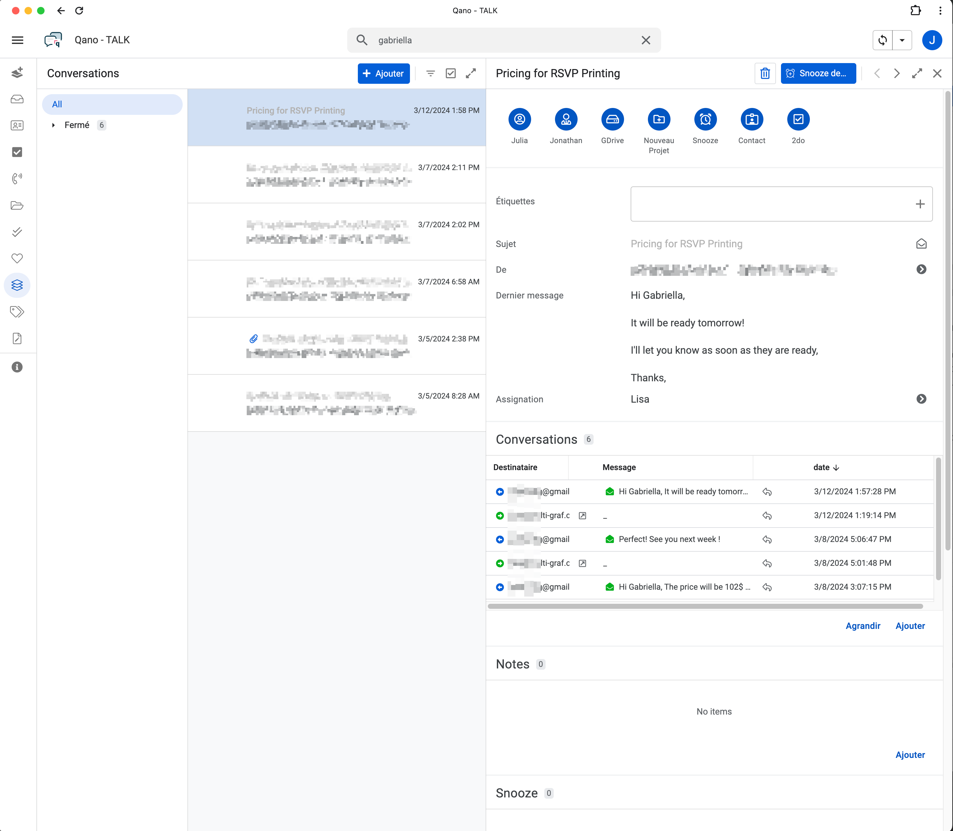 As mentioned above, Qano Talk was developed with the aim of having all our process that we could not find in a single tool. Qano Talk is a powerful, customizable and scalable tool, in addition to being linked to your other Qano tools. Emails are automatically associated to contacts, and you can see your communications in your other applications, either globally or linked to a project. We have even integrated all our phone calls, when a customer calls us or if we call a customer, a log is then automatically created in Qano Talk and automatically associated with the customer account which is visible in all our applications, so we have all incoming and outgoing calls for each of the clients that we can add notes to and link to existing projects. We have also added SMS to communicate quickly with our customers.